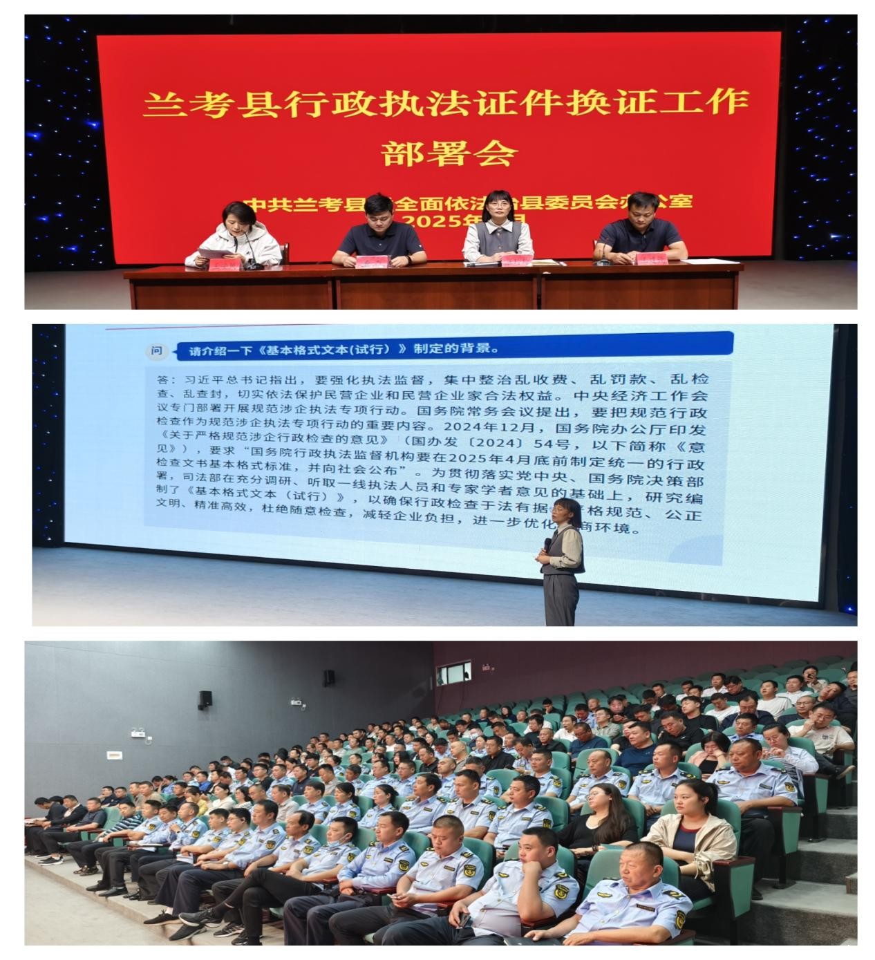 第二阶段,县司法局法制股股长王安凤宣读了《河南省行政执法协调监督局关于做好2025年度行政执法证件换发工作的通知》,对行政执法证件换发的范围、条件、程序等进行了详细说明;县司法局副局长崔玲玲同志强调了行政执法证件换发工作的重要性和严肃性,并对参会人员进行了行政执法专题培训。她结合实际案例,深入浅出地讲解了行政执法的基本原则、执法程序、执法文书制作等内容,进一步提升了参会人员的行政执法能力和水平。