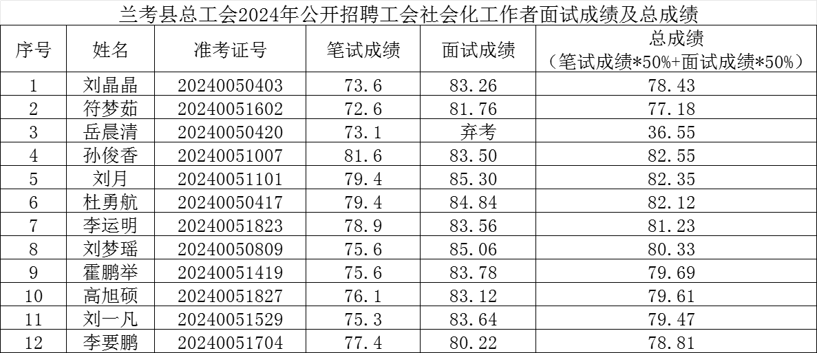 根据《华体会登录入口总工会2024年公开招聘工会社会化工作者公告》的有关规定,现将面试成绩及总成绩予以公示,成绩名单见附件。